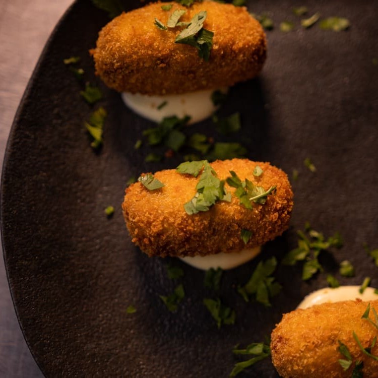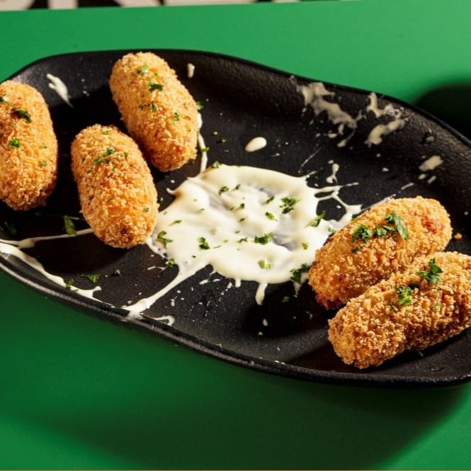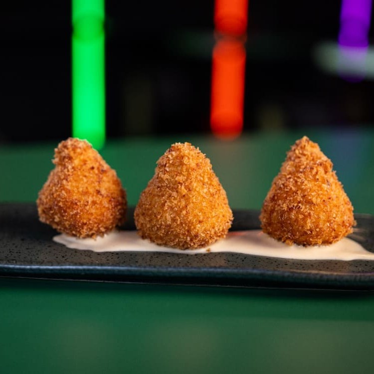 Croquetes à Carbonara de outro mundo, com cubos de bacon e creme de parmesão de produtores locais, servido com aioli de dijon.
