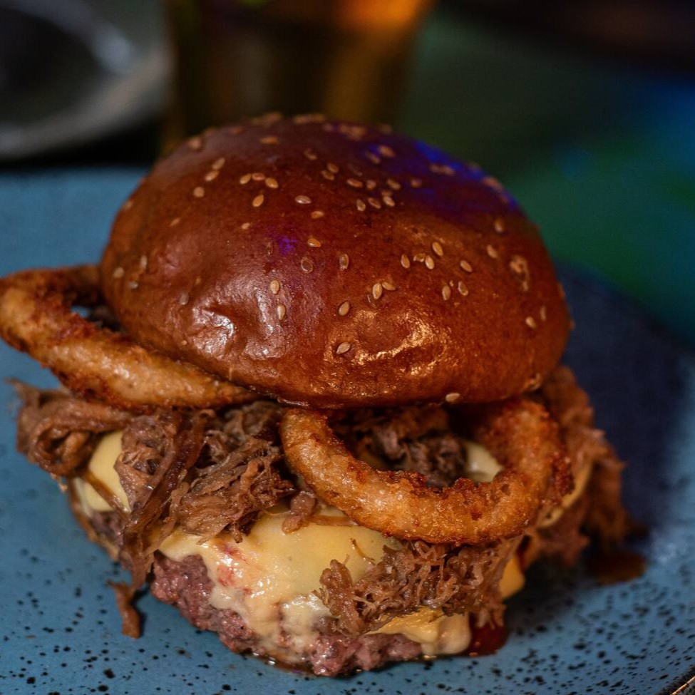 Blend 180g de costela + costela desfiada, Queijo prato, anéis de cebola crocante com katchup de goiabada no pão prime com gergelim