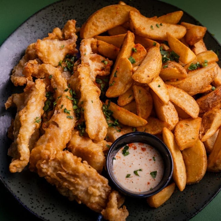 Filé crocante de tilápia fritinho na massa de tempura e batata rústica. Acompanha o absurdo aioli de gergelim.