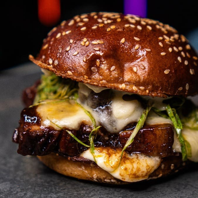 Sanduiche de Pancetta Suína agridoce, cozida no missô durante 15h, servido com Glace de Goiabada e couve fininha na acidez do limão.
