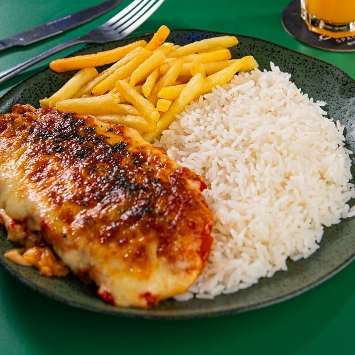 Suculento filé de peito de frango marinado 24h e empanado e frito, com molho de tomate gratinado com queijo minas. Acompanha arroz e fritas