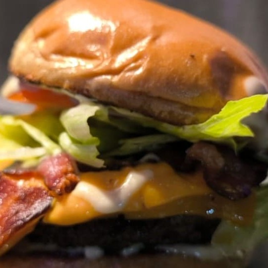 Blend 180g + bacon + cheddar, alface americana, tomate e molho espacial.