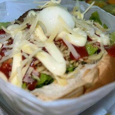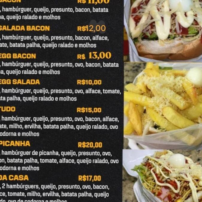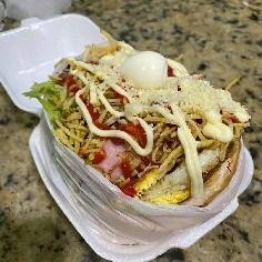Pão,carne,bacon,queijo, presunto, queijo ralado,ovo,molhos,ovivinh de cordana batata palha,milho,salada
