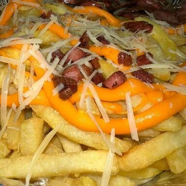 Batata maluca com: calabresa, bacon, queijo ralado e molhos