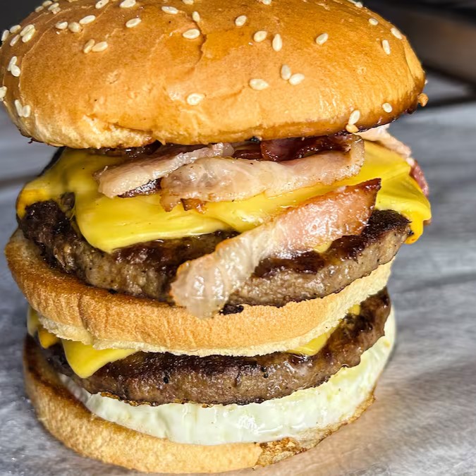 Pão, 2 hamburguers, 2 fatias de cheddar, ovo, bacon, molho especial