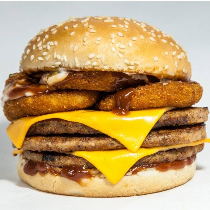 (Pão, 3 hamburguers, 2 fatias de cheddar, onion rings, maionese e molho barbecue)