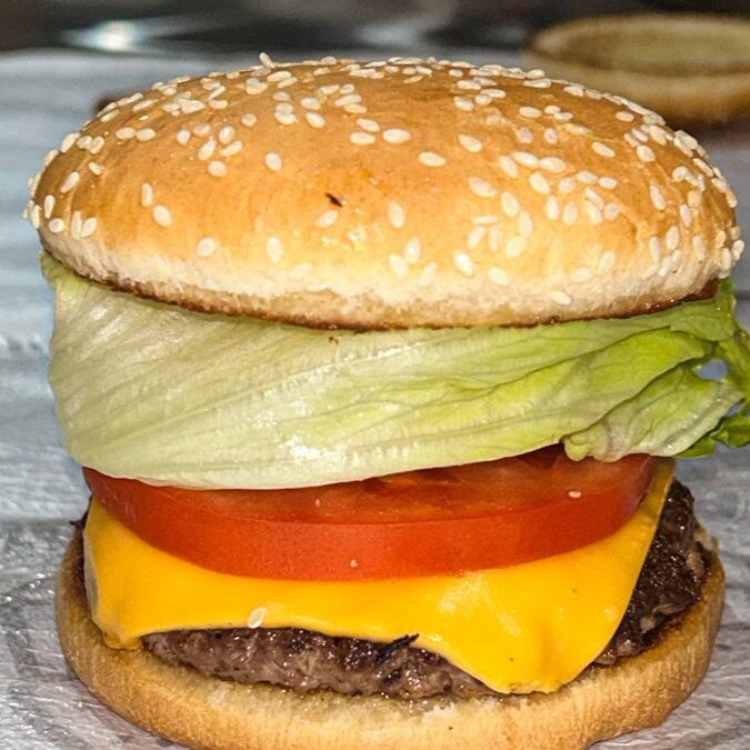 (Pão, hambuerguer artesanal 120g, queijo cheddar, salada e molho especial )
