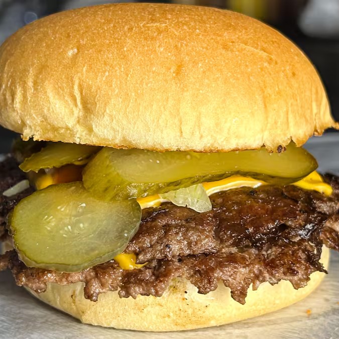 Pão smash classico 50g, 2 hambúrguer artesanal smash 70g, 2 fatias de cheddar, ketchup, mostarda, cebola e picles