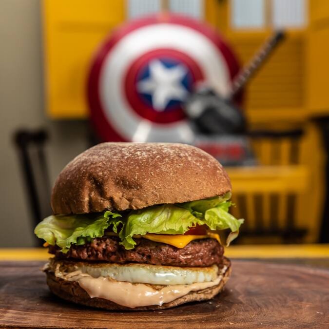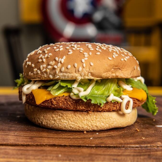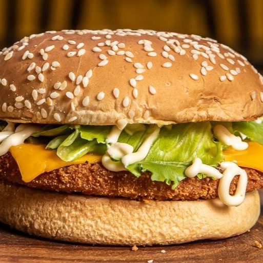 Pao australiano 56g, hamburguer vegetal de 60g, queijo cheddar, ovo e salada
