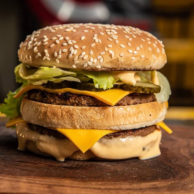 Pão, 2 hamburguers, 2 queijos cheddar, molho especial