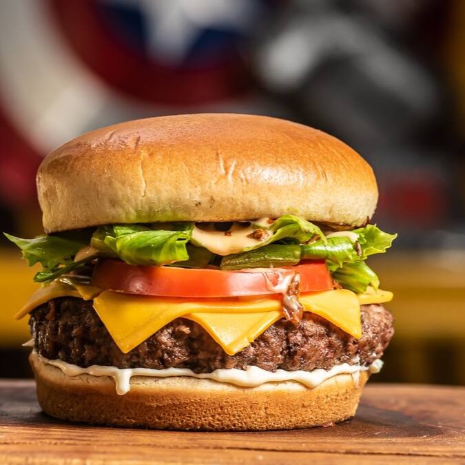Pão, hambúrguer de picanha 120g, 3 fatias de cheddar, ketchup, mostarda, cebola e picles.