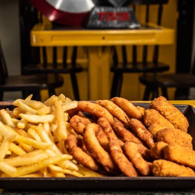 Aneis de cebola, tirinhas de frango(nuggets) e batata frita
