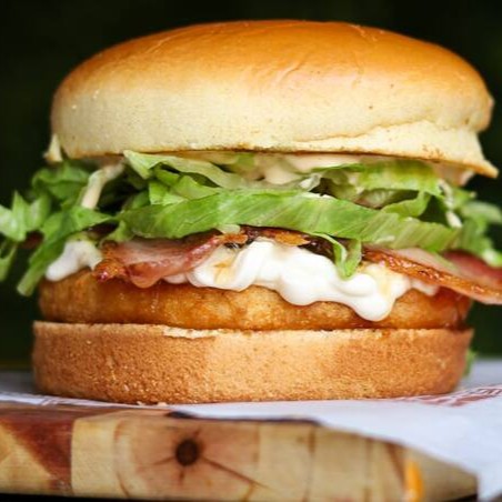 Pão Riviera 56g, Hambúrguer de frango empanado 90g, Bacon, alface e maionese.