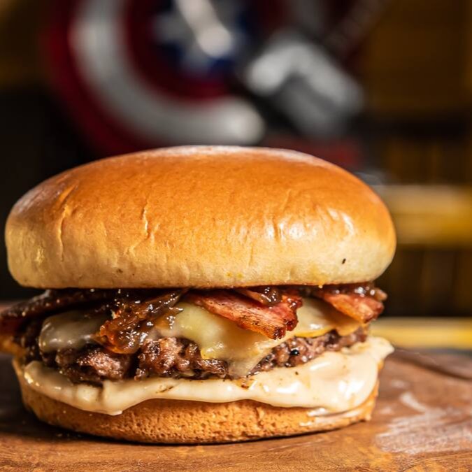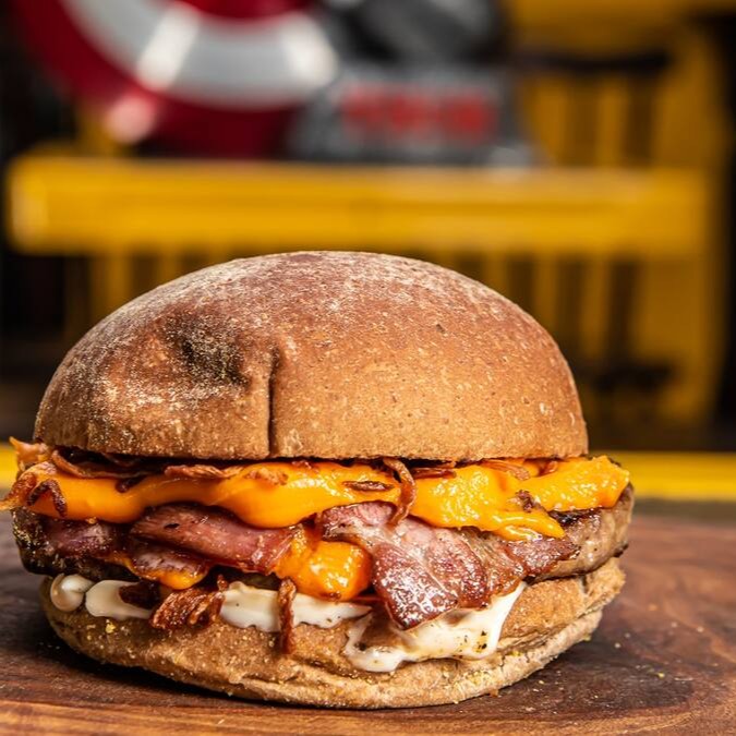 Pão brioche, hambúrguer artesanal 120 g, queijo provolone, bacon, cebola caramelizada e molho grill.