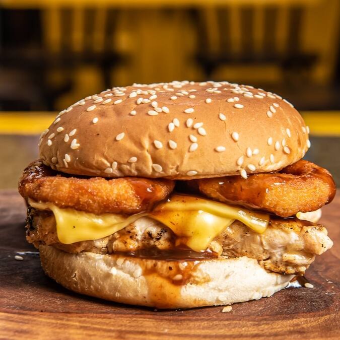 Pão, file de frango, queijo prato, 3 onion rings e molho Barbecue