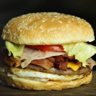 Pão, hambúrguer artesanal de 100g, queijo cheddar, ovo, bacon, presunto, salada e molho especial