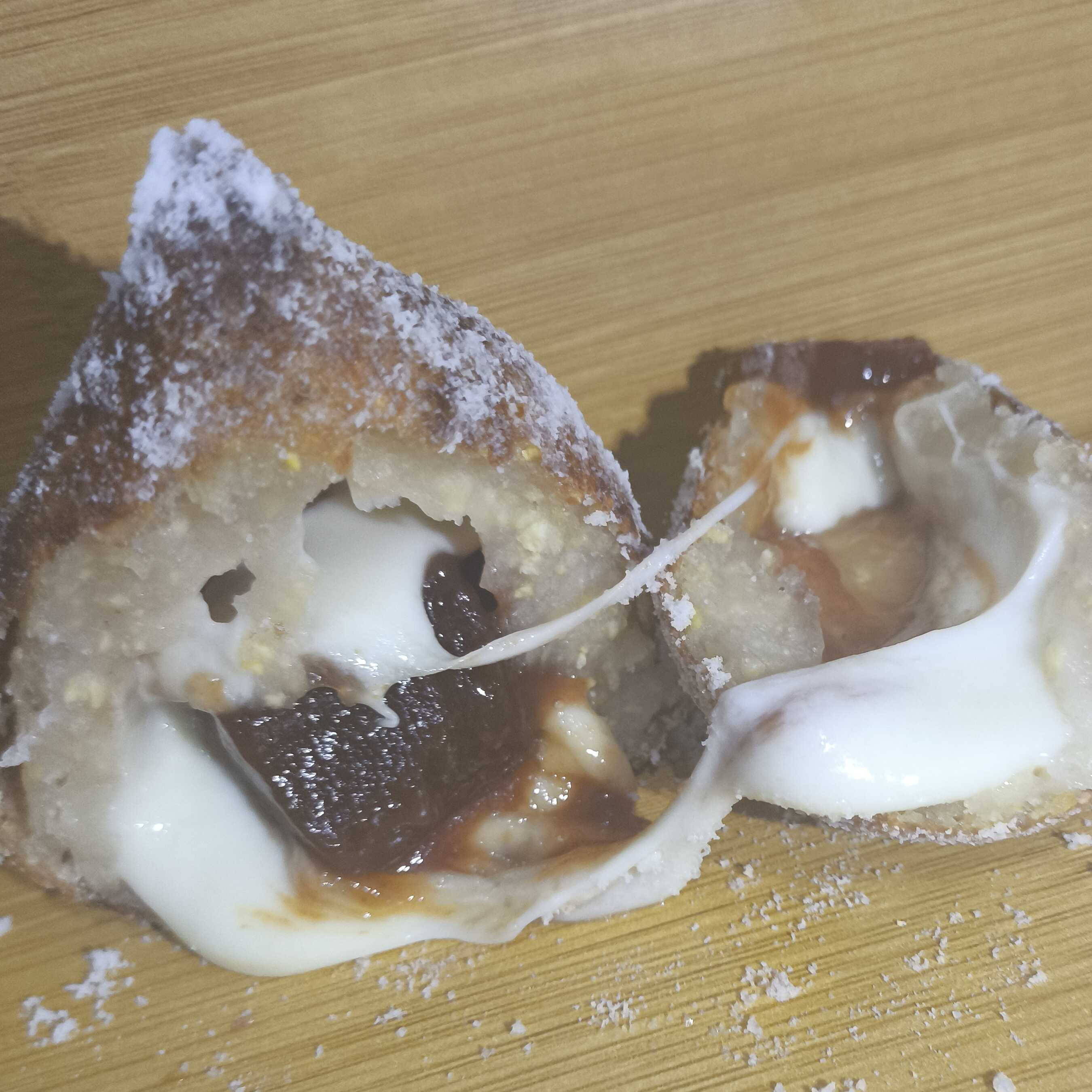 massa doce, recheio de doce de leite, polvilhada na canela e açúcar