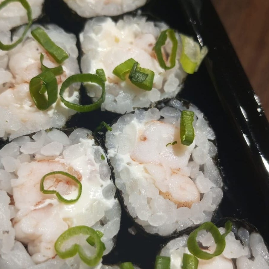 Enrolado em alga nori, arroz, cream cheese e camarão cozido. Finalizado com cebolinha. #sashimi #salmão #comida #japonesa #fatias #kani #maçaricado #sushi