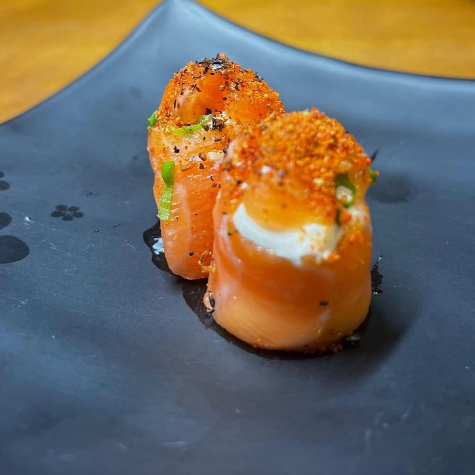Cream cheese envolto em fatia de salmão. Finalizado com salmão picadinho, pimenta togarashi, gergelim e cebolinha. #sashimi #salmão #comida #japonesa #fatias #kani #maçaricado #sushi