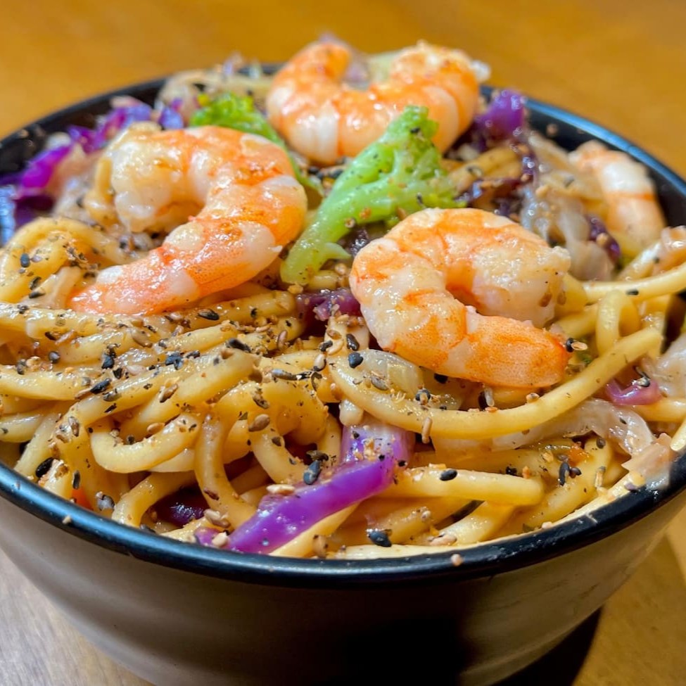 Macarrão lamén, brócolis, repolho verde, repolho roxo, cenoura, camarão e molho do chefe. Finalizado com gergelim.