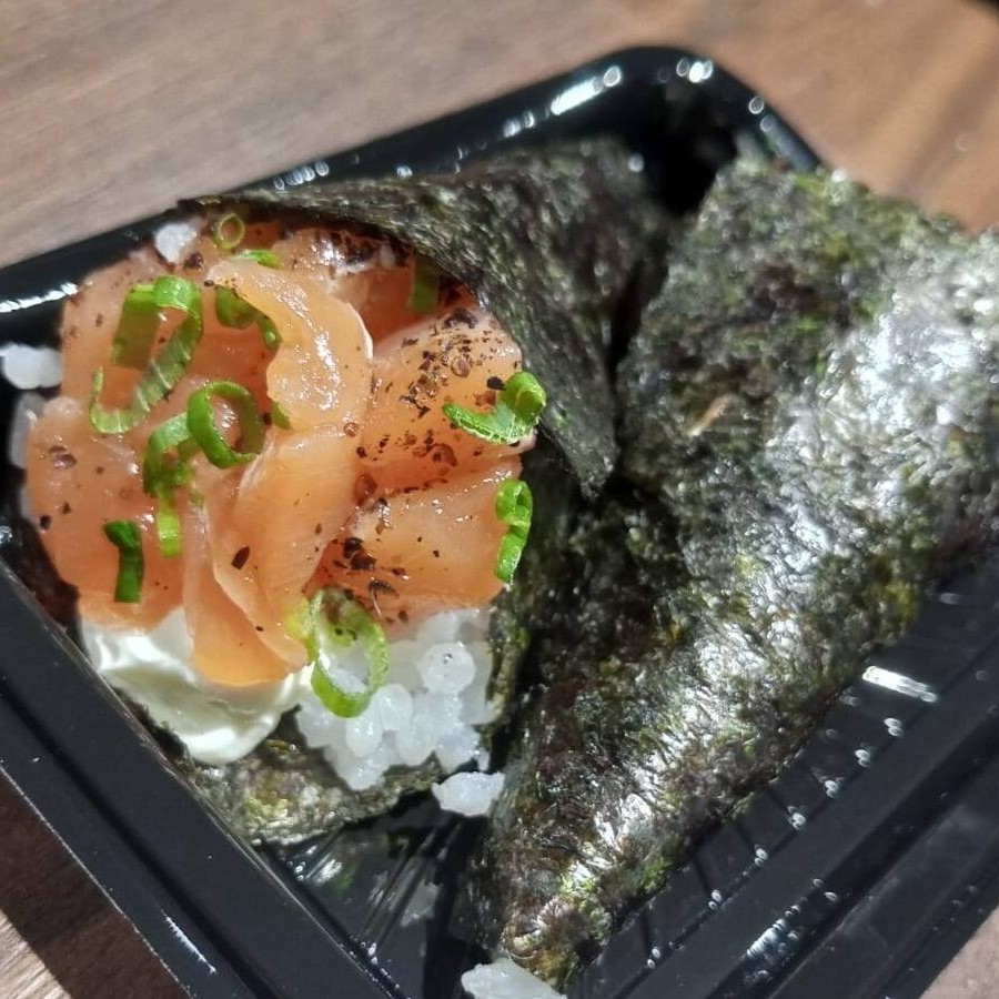 Kone de alga nori, arroz e salmão. #sashimi #salmão #comida #japonesa #fatias #kani #maçaricado #sushi Obs: Imagem ilustrativa