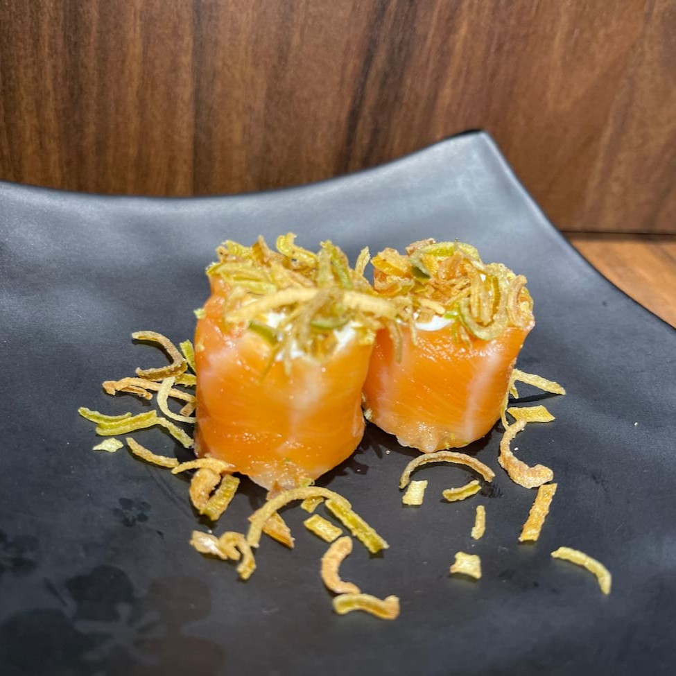 Cream cheese envolto em fatia de salmão. Finalizado com crispy de alho poró. #sashimi #salmão #comida #japonesa #fatias #kani #maçaricado #sushi