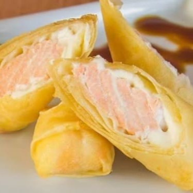 Rolinho primavera com salmão, cream cheese e cebolinha. #sashimi #salmão #comida #japonesa #fatias #kani #maçaricado #sushi Obs: Imagem ilustrativa