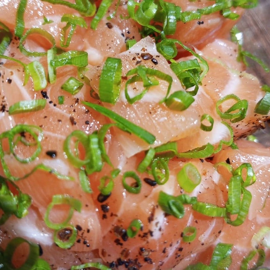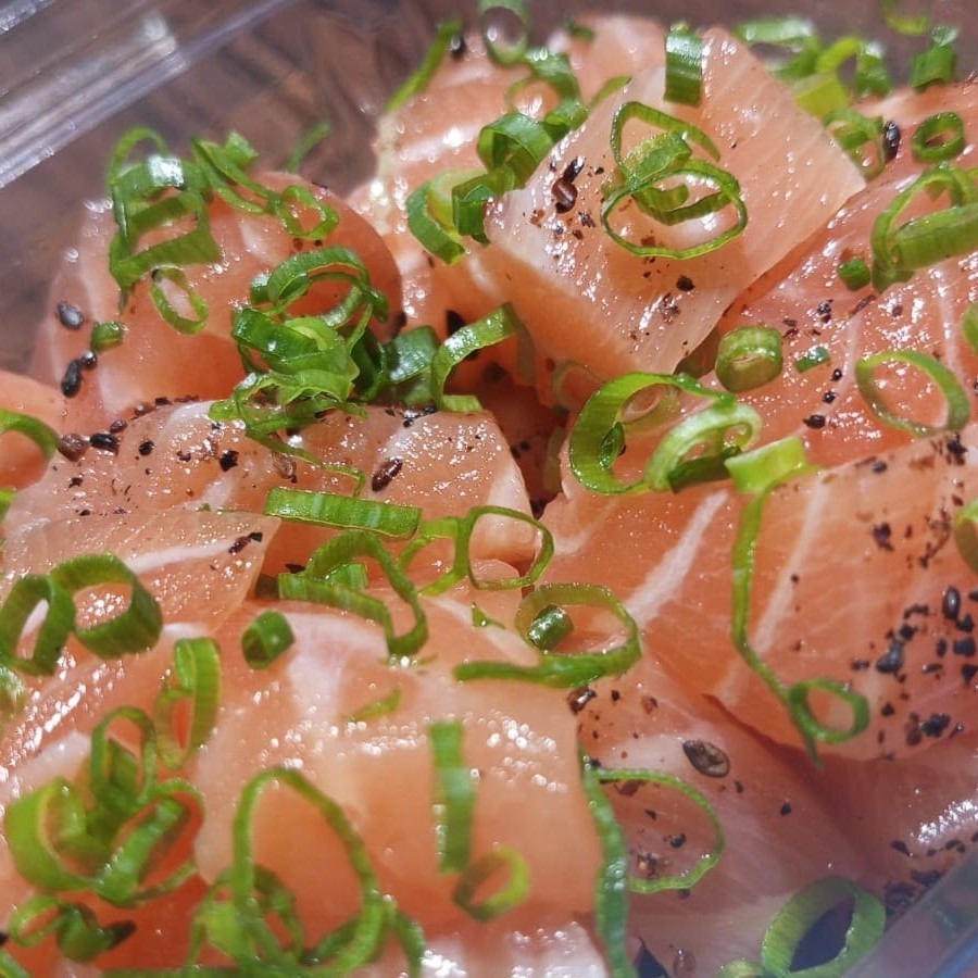 Picadinho de salmão. Finalizado com gergelim e cebolinha. #sashimi #salmão #comida #japonesa #fatias #kani #maçaricado #sushi Obs: Imagem ilustrativa