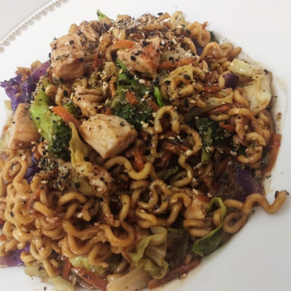 Macarrão lamén, brócolis, repolho verde, repolho roxo, cenoura, frango e molho do chefe. Finalizado com gergelim.