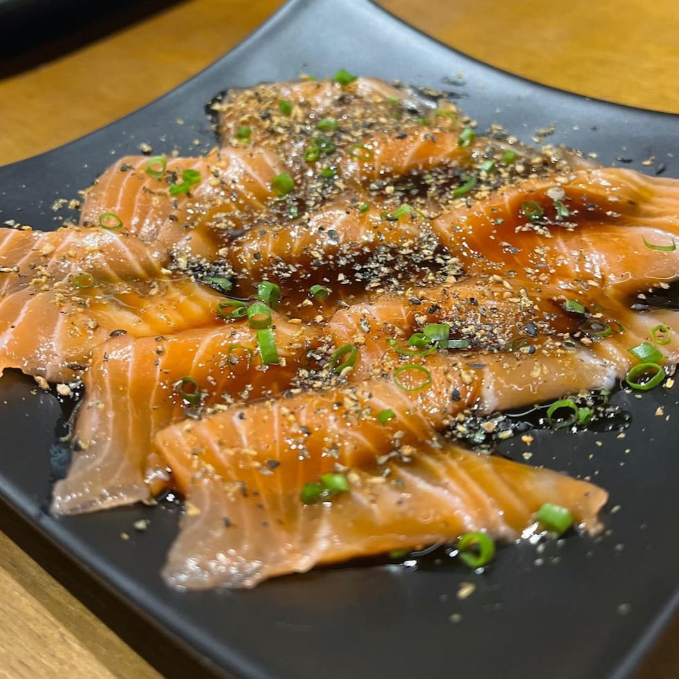 Fatias finas de salmão, finalizado com molho teriaky, gergelim e cebolinha