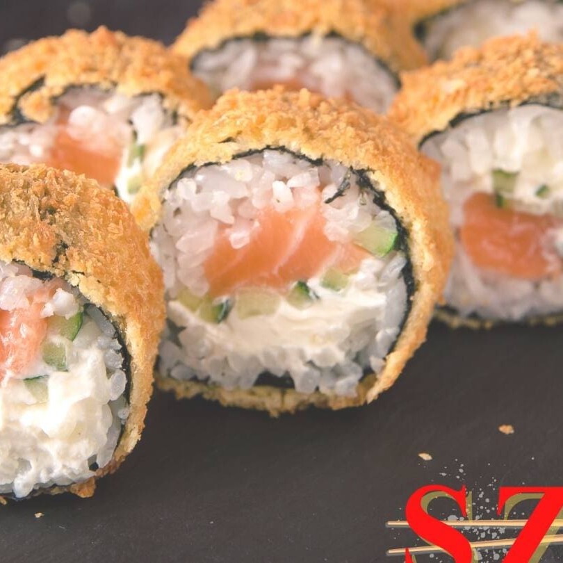 Pequeno temaki de salmão com cream cheese e cebolinha. Empanado e frito