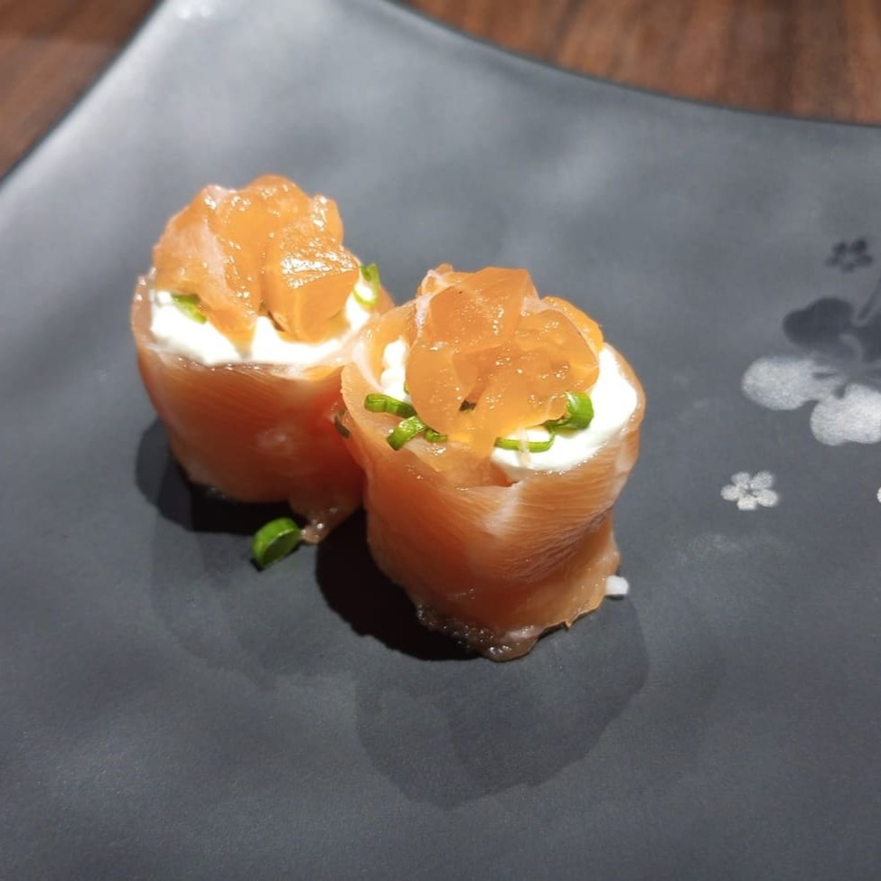 Cream cheese envolto em fatia de salmão. Finalizado com salmão picadinho, gergelim e cebolinha. #sashimi #salmão #comida #japonesa #fatias #kani #maçaricado #sushi