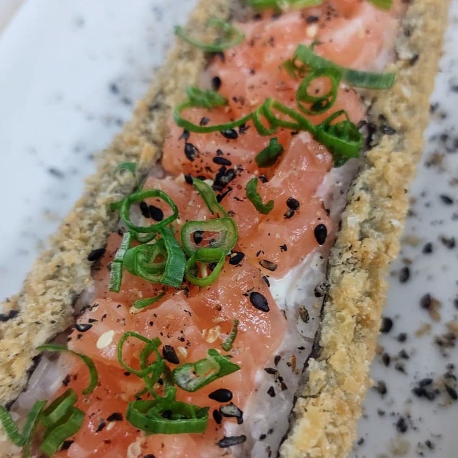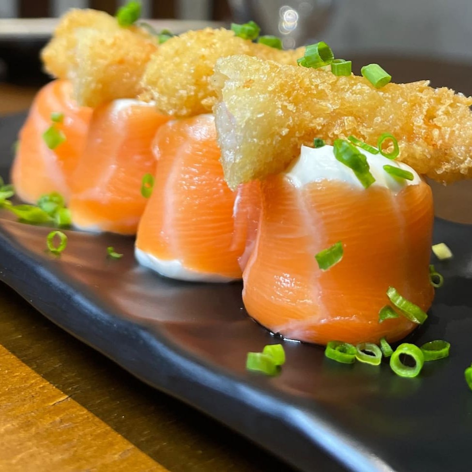 Enrolado em alga nori, arroz com pastinha de salmão cozido, cream cheese e tempero do chefe. Empanada em farinha panko e frito. Finalizado com molho teriyaki e cebolinha. #sashimi #salmão #comida #japonesa #fatias #kani #maçaricado #sushi