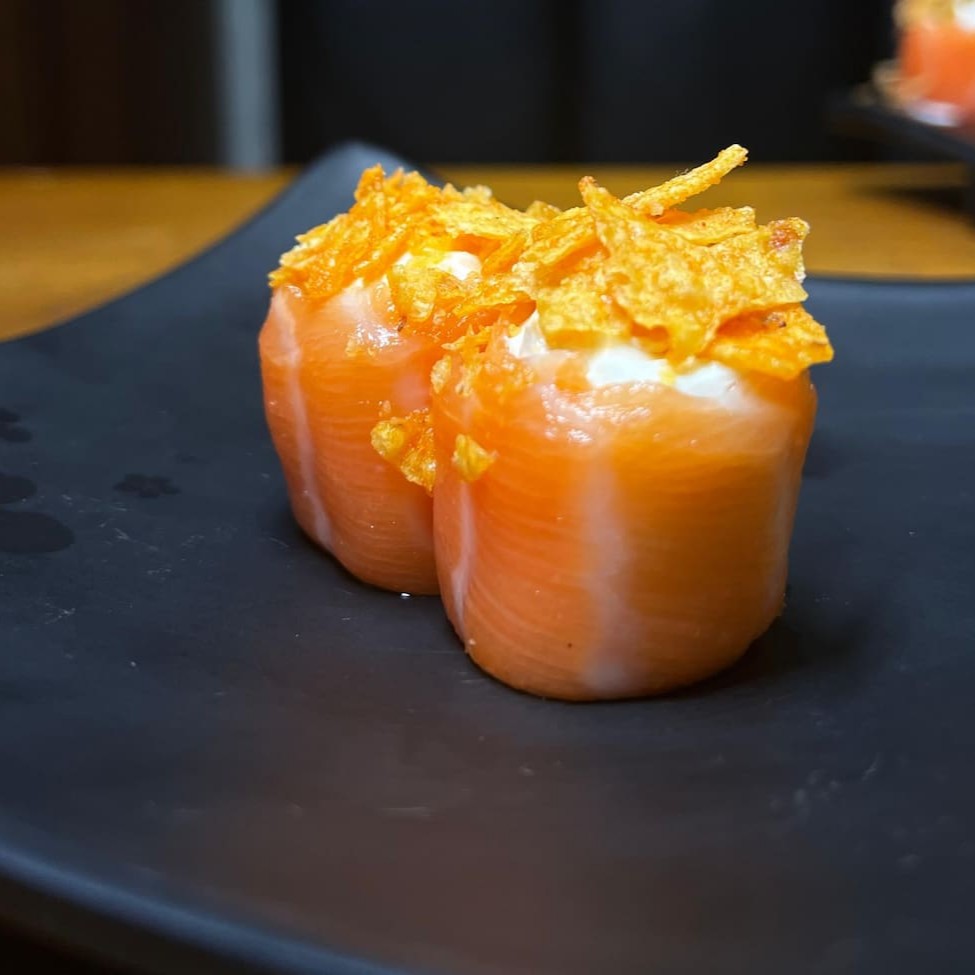 Enrolado em alga nori, arroz, cream cheese e salmão. Empanada em farinha panko e frito. Finalizado com cream cheese, Doritos e geleia de pimenta. #sashimi #salmão #comida #japonesa #fatias #kani #maçaricado #sushi