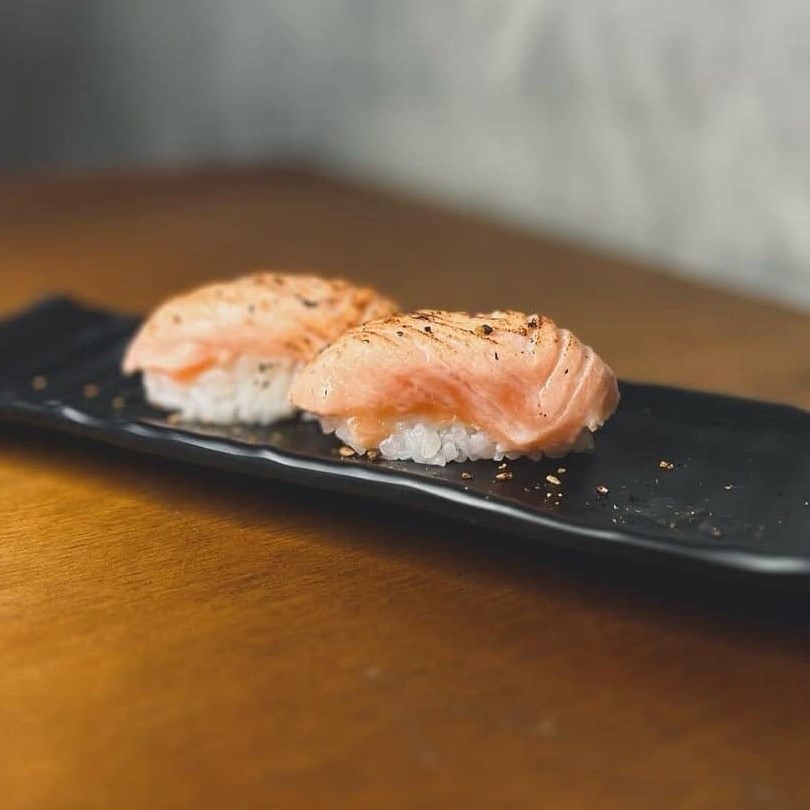 Arroz shari com pele de salmão grelhada. #sashimi #salmão #comida #japonesa #fatias #kani #maçaricado #sushi Obs: Imagem ilustrativa
