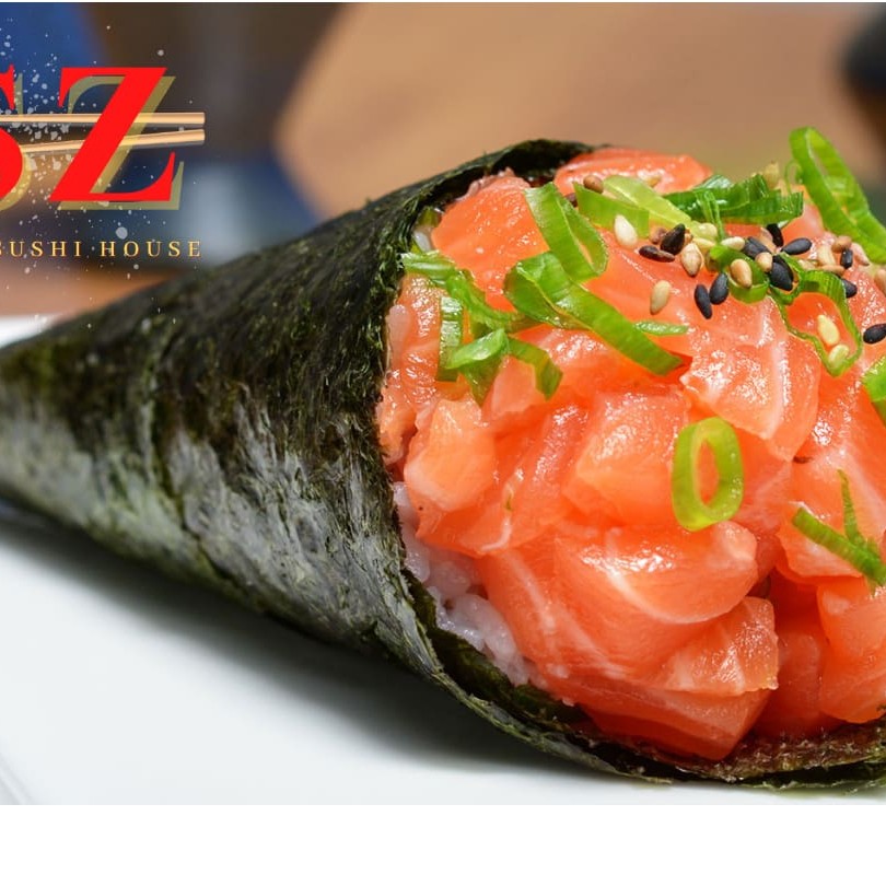 Pequeno temaki de salmão com cream cheese, gergelim e cebolinha