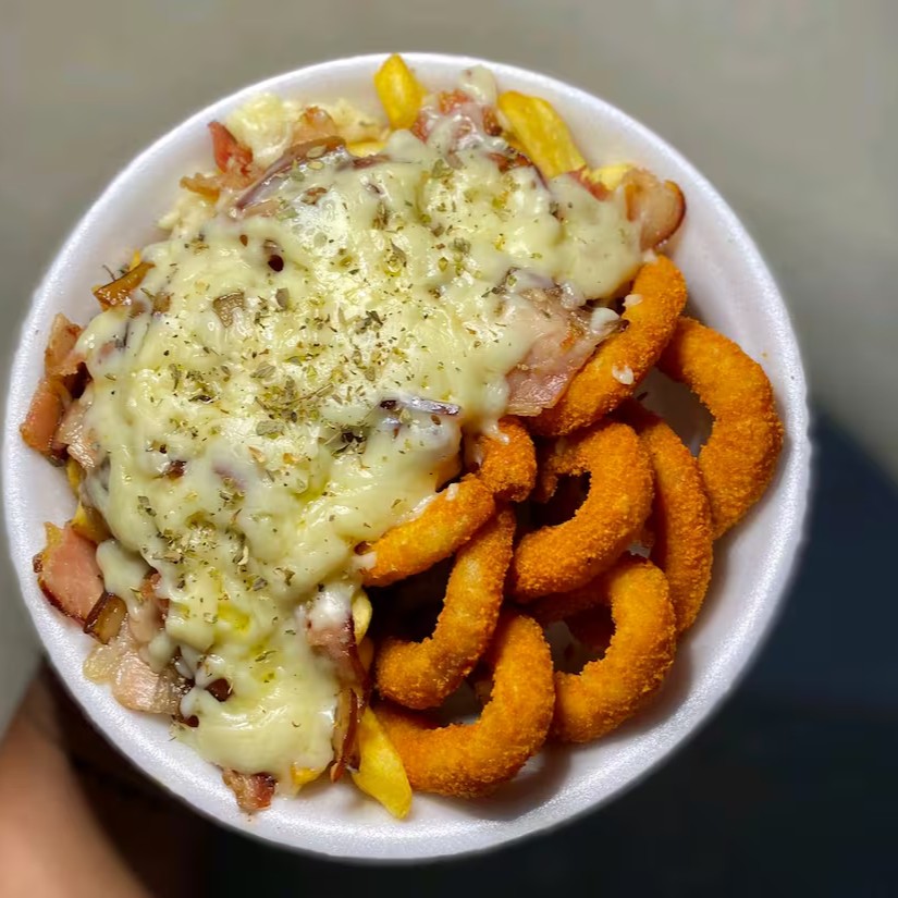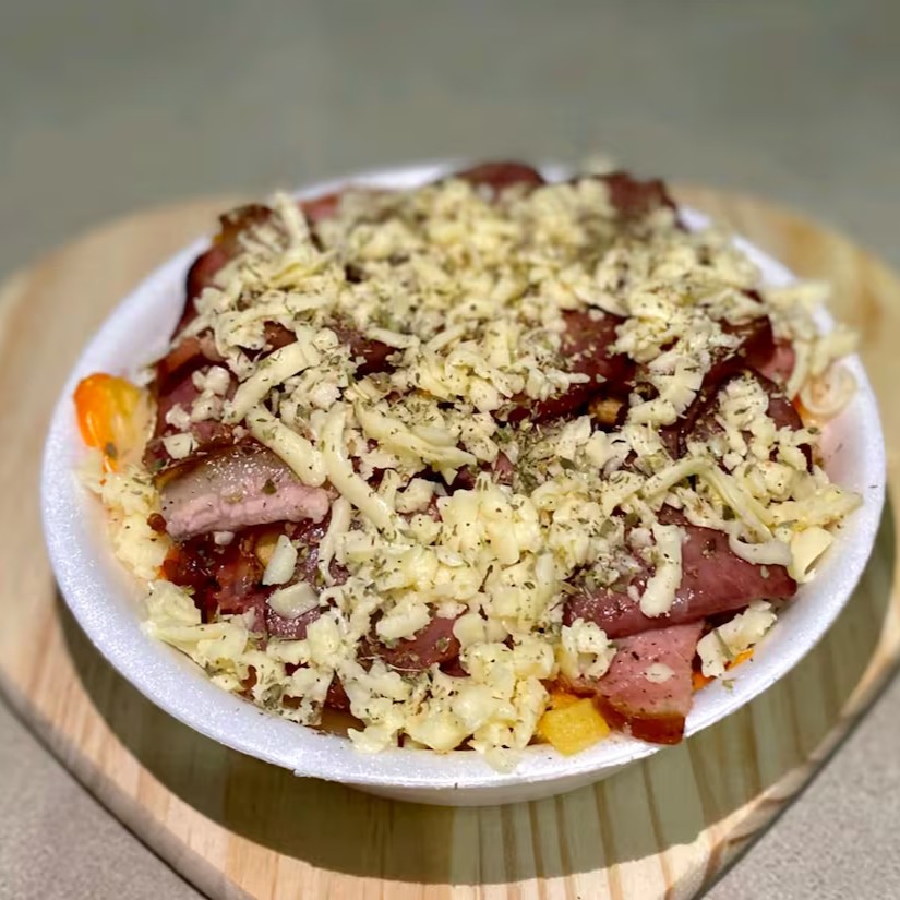 Batata, bacon , calabresa,Catupiry ,Cheddar, mussarela e orégano