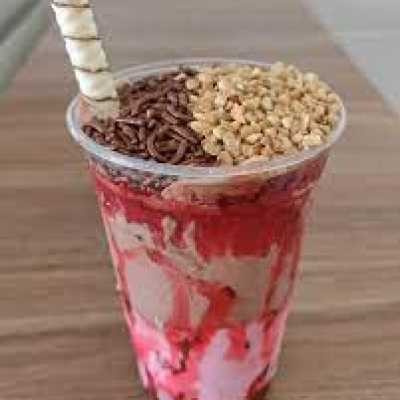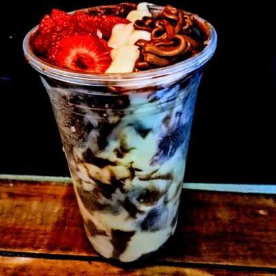 Açaí acompanhado de amendoim, granola, leite em pó, creme de avelã com chocolate, morango e cobertura de morango