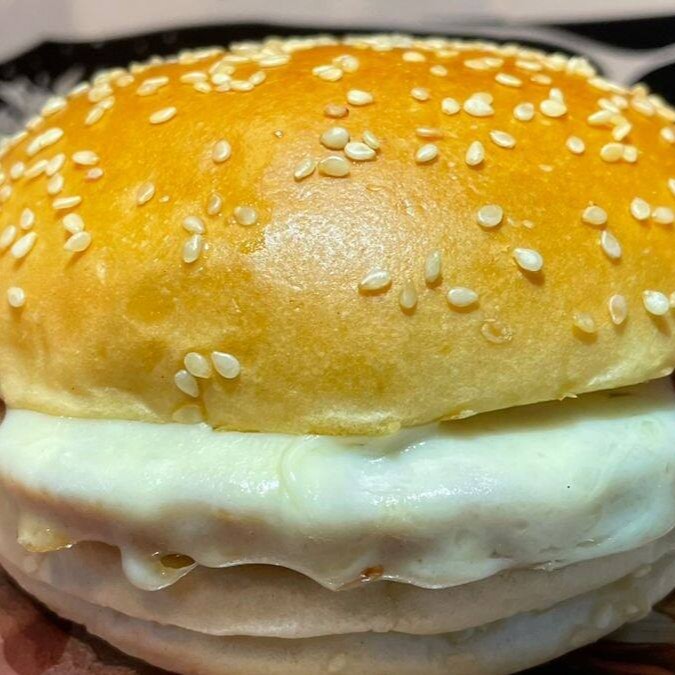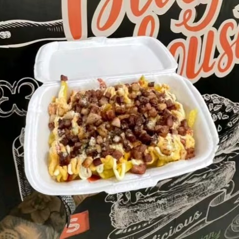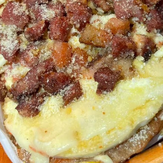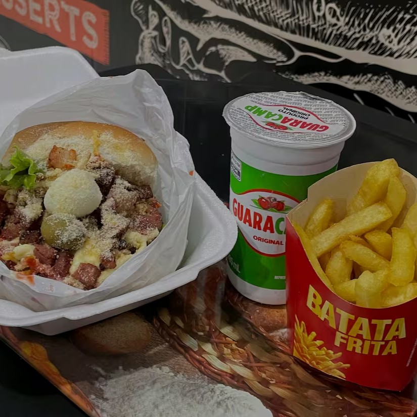 Pão, carne, ovo, bacon, calabresa, queijo, presunto, batata palha, molho e queijo ralado