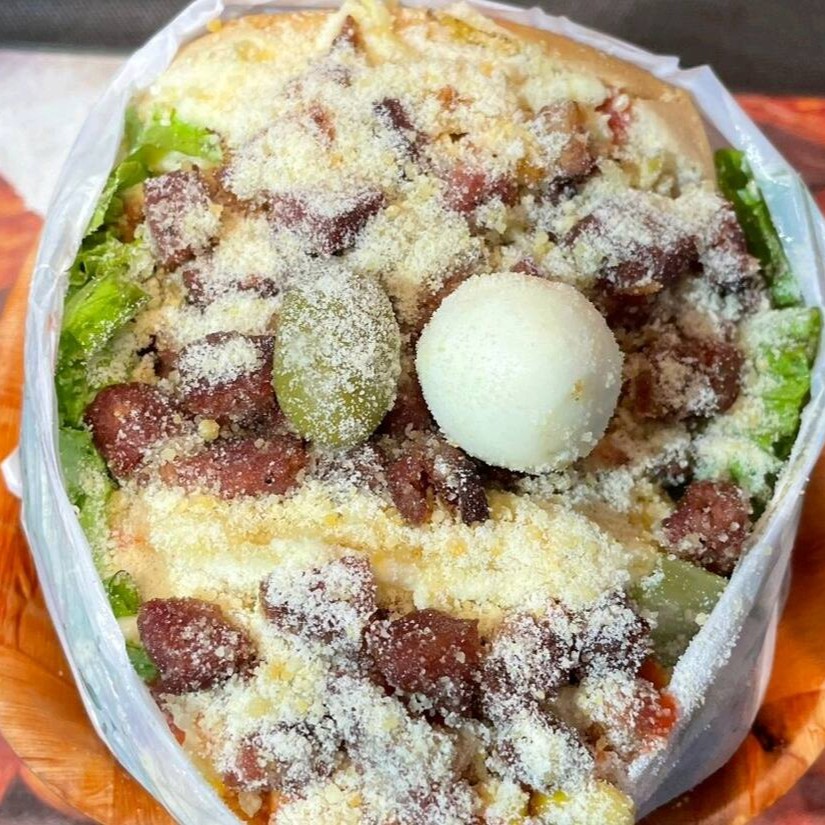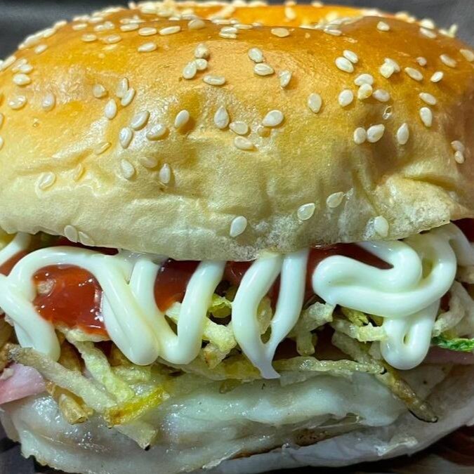 Pão, 3 carne, 2 ovos, queijo, presunto, Bacon, calabresa, alface, tomate, milho, ervilha, passas, batata palha, maionese, ketchup, ovo de codorna, azeitona, queijo ralado