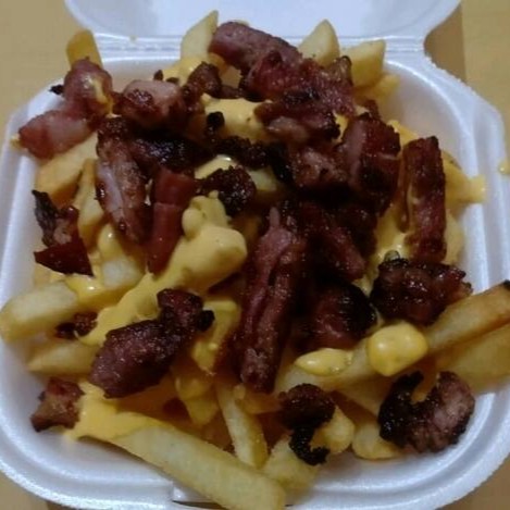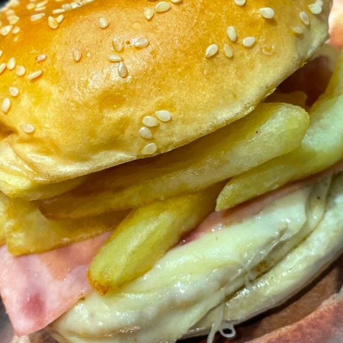 Pão, carne, queijo, presunto, batata frita dentro do lanche e molho