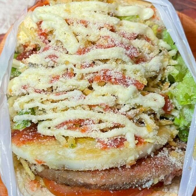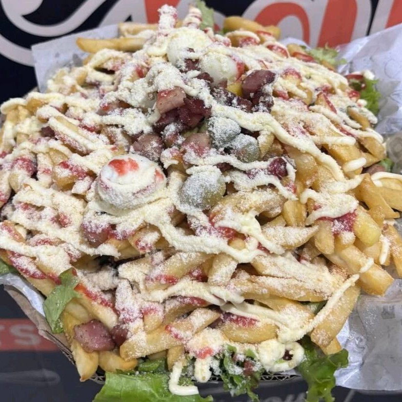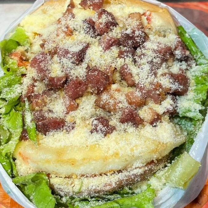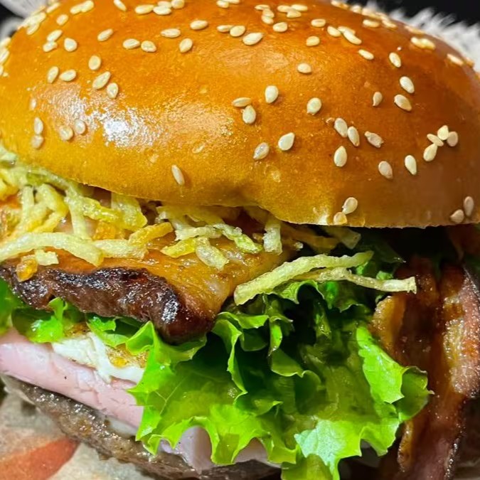 2 fatias de Pães, 2 carnes, 2 ovos, queijo, presunto, Bacon, calabresa, alface, tomate, milho, ervilha, batata frita, ovo de codorna, azeitona, molho e queijo ralado