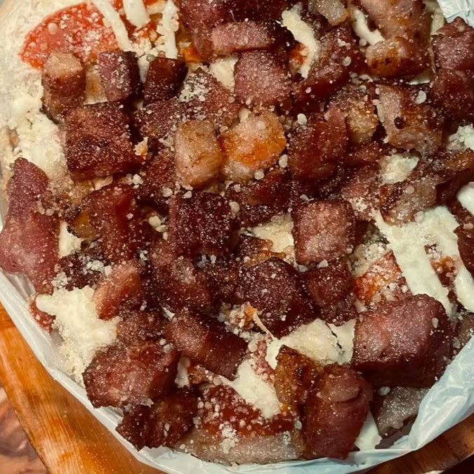 Pão, carne, queijo, presunto, batata palha, molho, bacon, calabresa e queijo ralado